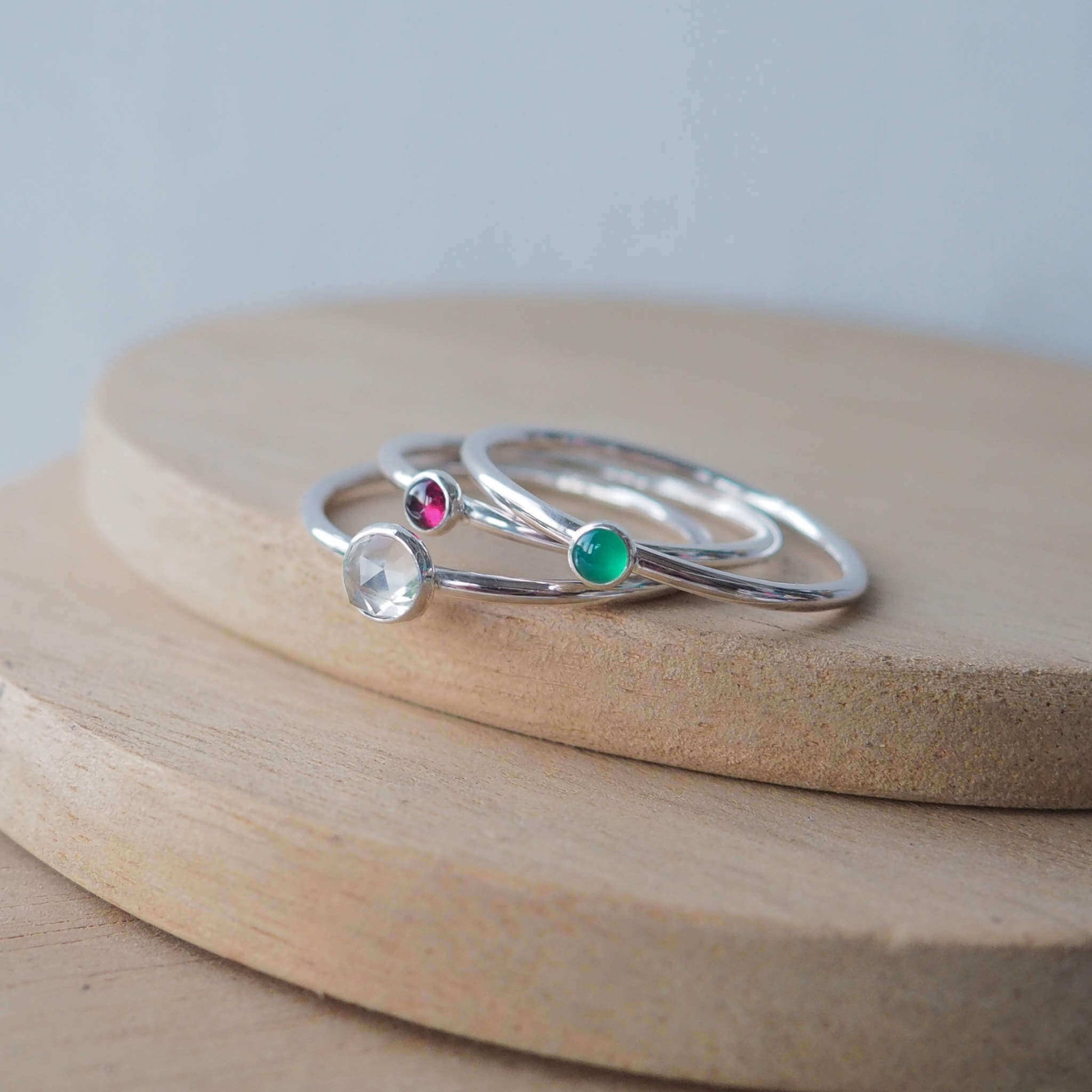 The set comprises of one 5mm White Topaz gemstone ring and two 3mm sized gemstone rings of your choice.