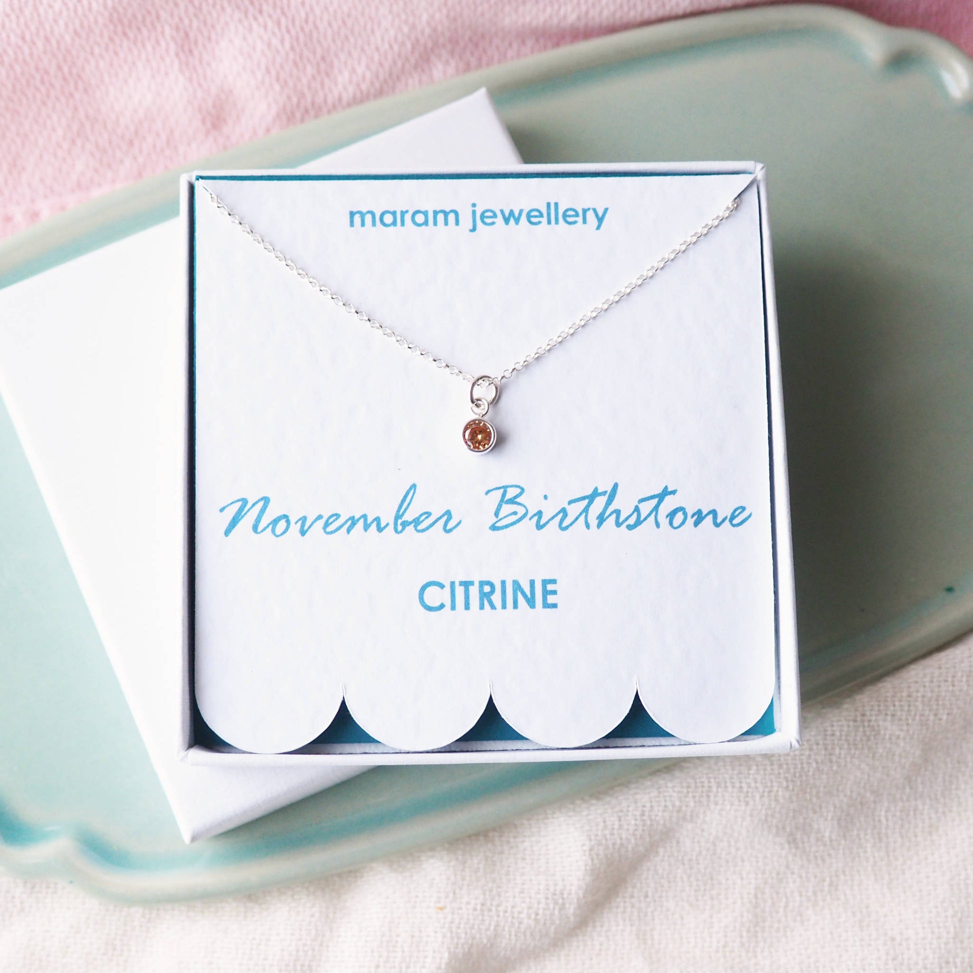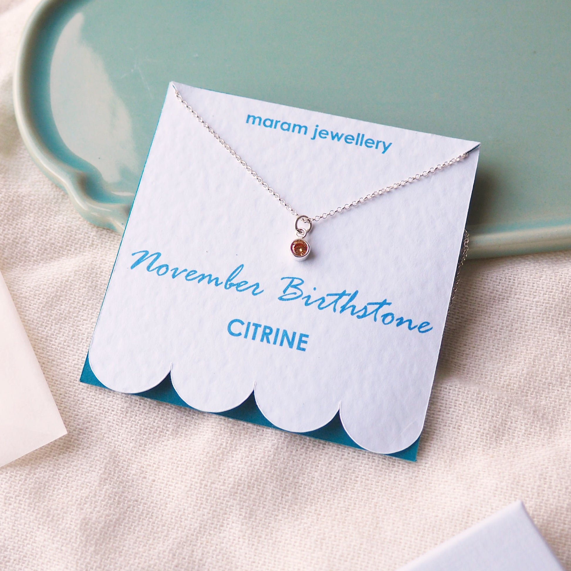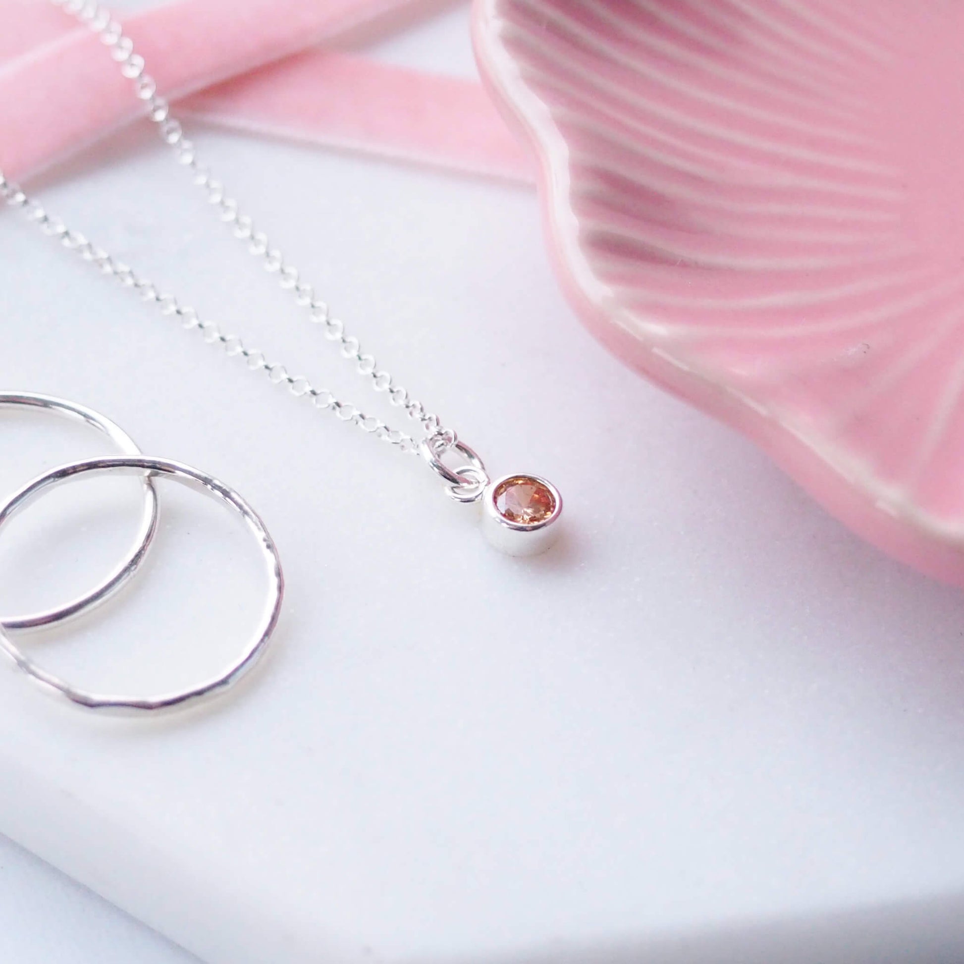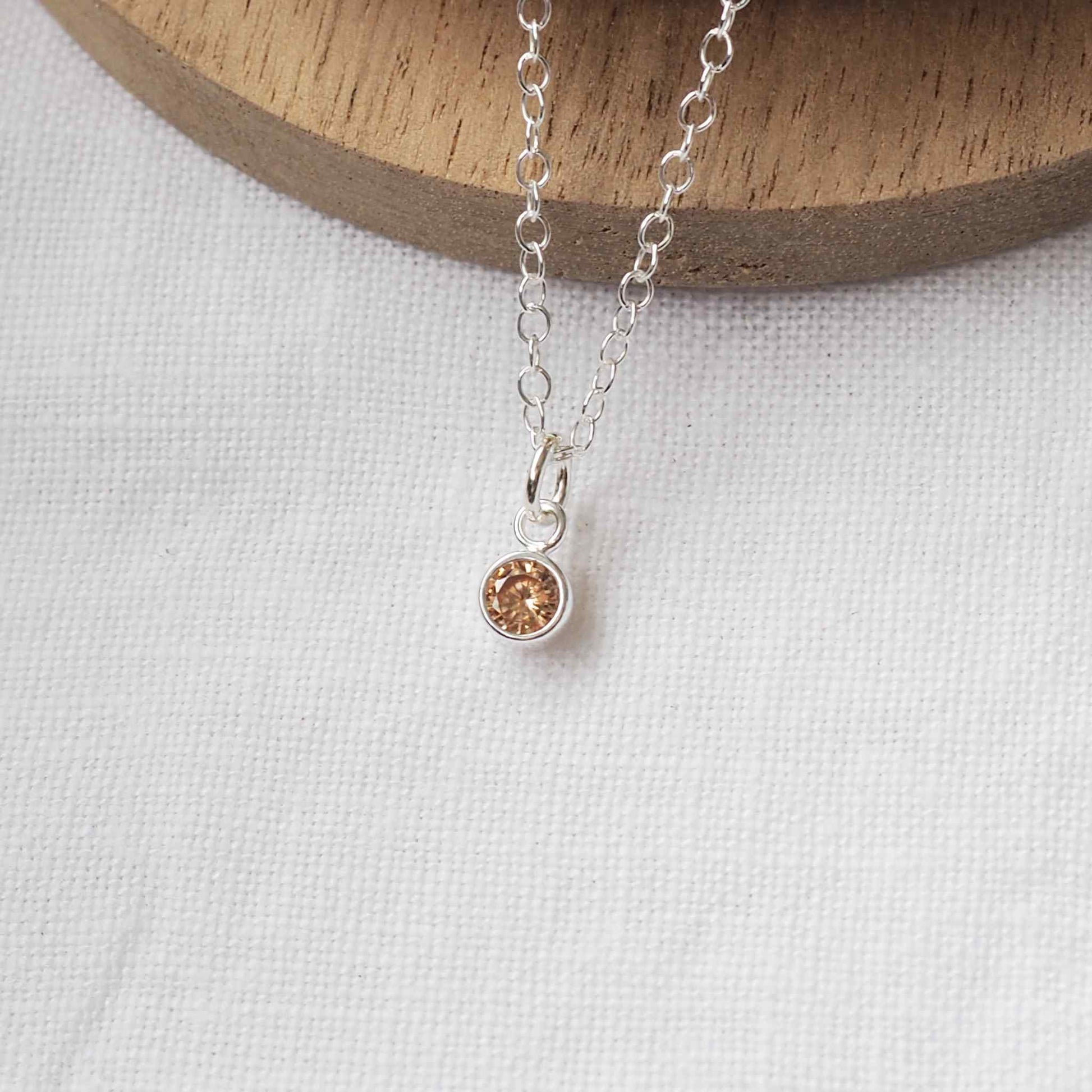 Citrine Yellow and Sterling Silver simple gemstone pendant with a Topaz coloured cubic zirconia gemstone. Measuring a petite 4mm this is a very subtle and understated pendant with a round facet cut stone set onto a surround of Sterling Silver with a simple loop. The pendant is available with a simple belcher/trace chain in a choice of lengths making it a suitable gift for all ages.