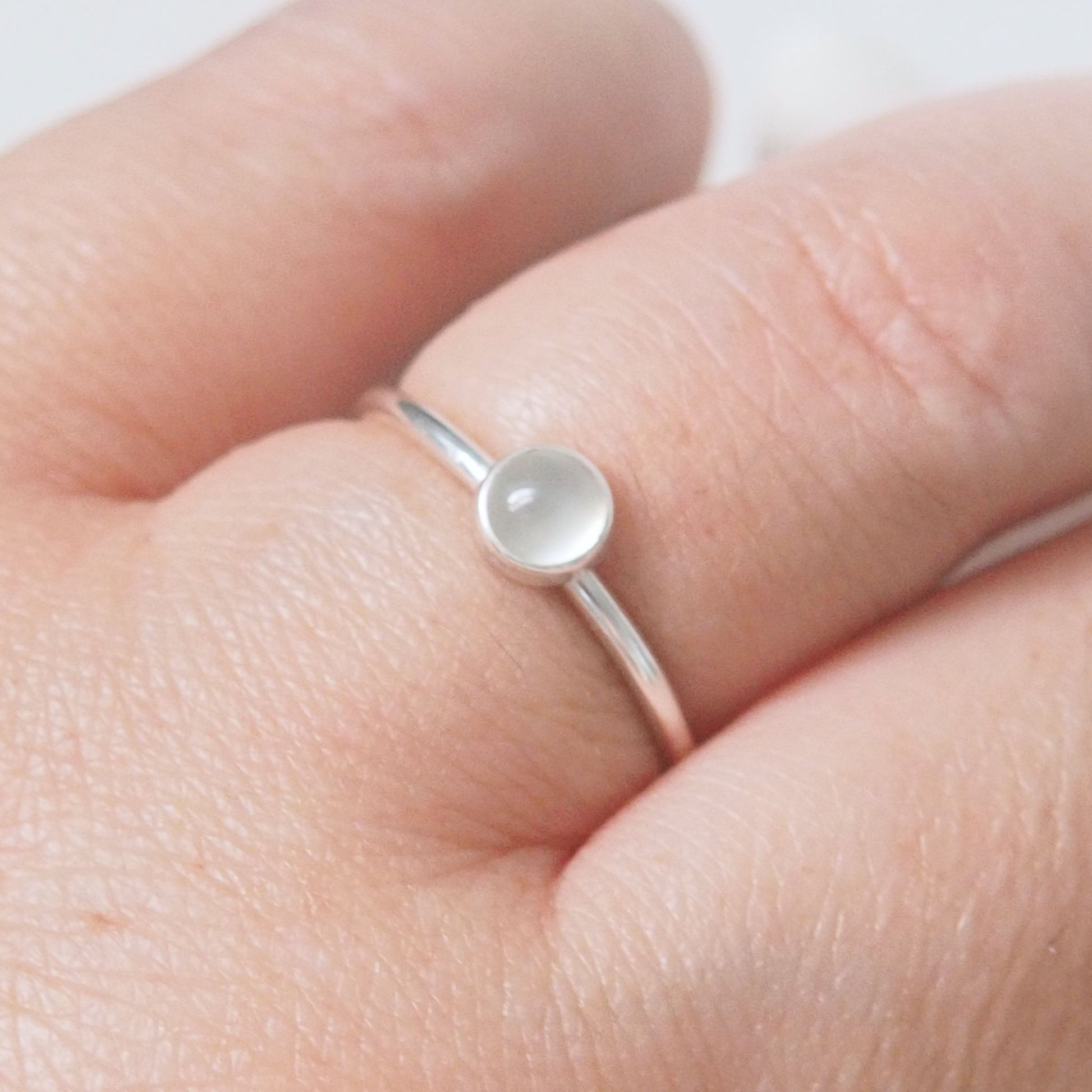 Sterling Silver and Moonstone Birthstone ring. Made from a band of 1.5mm round sterling silver wire, with a 5mm round Moonstone. The moonstones used are an opaque milky white. Beautifully simple. Polished silver finish.